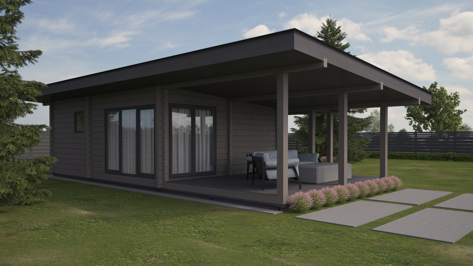 Sauna 1- это современная баня из клееного бруса с большой зоной отдыха, и террасой для барбекю.